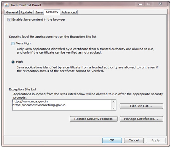 When you click on "Select Certificate" and DSC is not selected while using it on the MCA21, or 'Select Certificate' button not working on MCA website or Unable to Register/Select Digital Signature Certificate(DSC) on MCA website, it is a problem of Java.