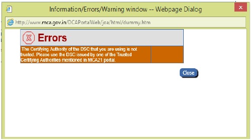 1. Sometime MCA website does not recognise the trusted chain of certifying authority so you are requested to upload the PDF form after some time.