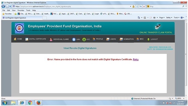 The name provided while registering the Digital Signature Certificate (DSC) on Employees Provident Fund Website is different from name given in the Digital Signature Certificate (DSC).