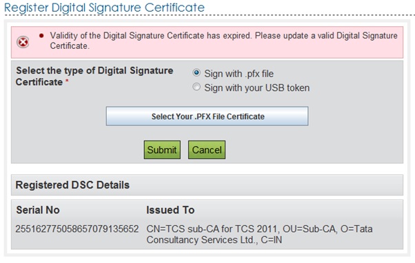 When a user trying to register Digital Signature Certificate (DSC) on Income Tax e-filing Website, the error displayed "Validity of the Digital Signature has expired. Please update a valid Digital Signature Certificate" or as shown in following image: